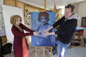Ongetwijfeld zijn er veel meer kunstenaars die werk kunnen leveren voor een expositie als deze. Wie weet, herhalen we het een keer. Op de website staan de werken van de deelnemende kunstenaars en een aantal uitspraken/ervaringen. Niet komen kijken! Blijf weg! was te zien van 14-16 maart 2025 bij studio MONK in Nijmegen. Zelden zo’n druk bezochte expositie meegemaakt. Het copyright voor de afbeeldingen ligt bij de kunstenaars. De foto van Gaby en mij voor het portret waar we de tepels bedekken is van Gerard Verschooten.