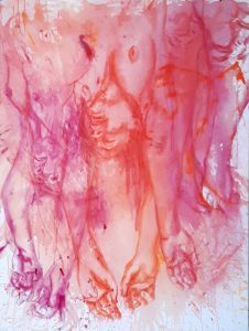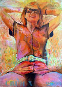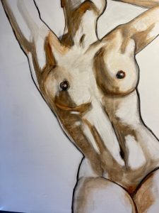Gaby Haerkens: Bij deelname aan een kunstbeurs in 2023, met o.a. dit werk, kreeg ik de vraag van een studente museologie of ik veel kritiek kreeg op mijn werk. Dit, omdat ik alleen vrouwen schilder en dan ‘ook nog’ op hun vrouwelijkst. In de museum-wereld bleek hier een discussie over te zijn, dat dit eigenlijk niet meer kan. Ik wist niet wat ik hoorde. Bij het inrichten van een expositie in een ziekenhuis in 2024 voelde ik bij dit schilderij al ‘nattigheid’, en dat bleek juist. Na beraad van de kunstcommissie werd besloten dat het beter was om dit schilderij, met zichtbare tepels, niet op te hangen. Voor het geval dat… Ik ben opgegroeid in de jaren ’70, en wij stonden op een naturistencamping. Naakt was volledig normaal. Waar is dit misgegaan? Dat zichtbaar, liefdeloos geweld meer geaccepteerd is, dan zichtbaar, liefdevol bloot?