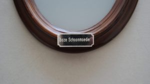 Tepel, Boze Schoonmoeder, Harde Plasser Drieluik, Ral 7045, Geschilderd glas in lijst, gegraveerde labeltjes.
