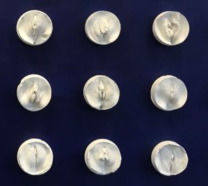 Viva la Vulva 40 vulva afdrukken van gips, gemaakt voor de documentaire “Tussen de lakens met Geraldine”