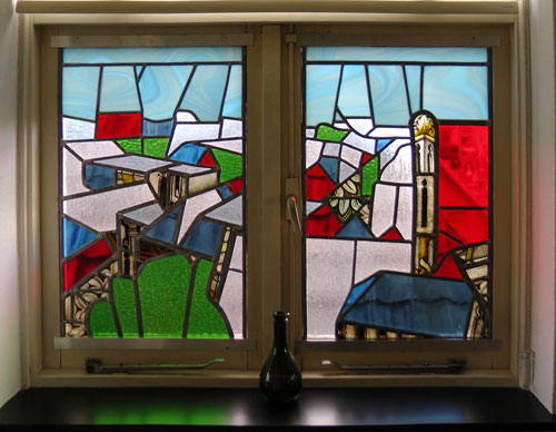 Het uitzicht uit het raam aan de linker kant van het appartement is vertaald in glas in lood. Het raam waar het geplaatst is, keek uit op een zwart pannendak. Nu niet meer. In de blauwe en de rode gedeeltes is dat nog te zien. Hierdoor wordt het effect van de daken wel meer versterkt. juni 2011 (2 x 45 x 77cm) Op You tube staat een time laps-filmpje waarin te zien is hoe het raam gemaakt is: https://www.youtube.com/watch?v=I-7nau-_njM