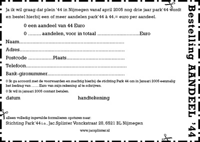 Om de uitvoering van het projekt Park‘44 betaalbaar en haalbaar te maken kunt u vanaf nu aandelen Park’44 bestellen.