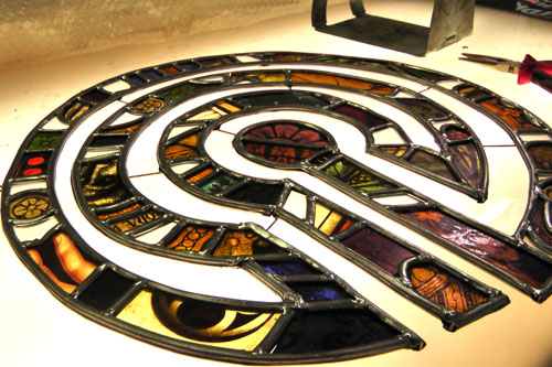 Labyrinth Gemaakt als afscheidskadootje van het personeel voor een directeur. Gemaakt met allemaal reststukjes gebranschilderd glas. Doorsnee ongeveer 50 cm