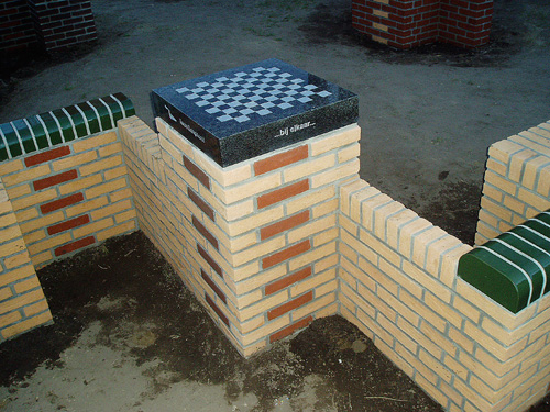 Metselwedstrijd07 12 leerlingmetselaars metselden samen: Una Tecum. Dat is Latijn voor: Bij Elkaar. Zes zitelementen waar je wel bij, maar niet tegenover elkaar zit. Te zien in de Pink Floydstraat in Lent.
