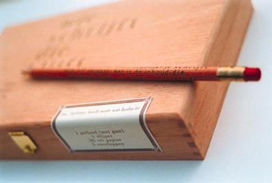 Het tweede gebruiksvoorwerp met gedicht, Een Theedoek Twee Knijpers was het eerste, werd een potlood. Uitgegeven in 1998.