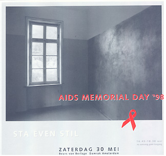 Van 1995 t/m 1999 heb ik jaarlijks een poster gemaakt voor Aids Memorial Day. Die opdracht kreeg ik omdat ik een keertje met de organisatie gebeld had met de mededeling dat ik een ideetje had voor een poster. Vonden ze leuk, mocht ik maken… heb ik vijf jaar achter elkaar gedaan… Toen belde er een ander vormgever met de organisatie… die had een beter idee dan ik…ook leuk.