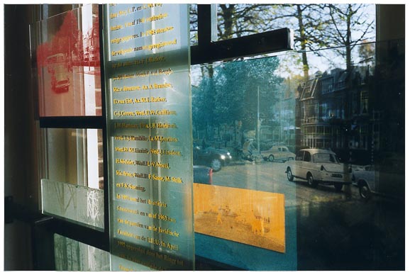 Constructie van glas en staal. 1999 afm 90 breed 240 hoog. Vijf afbeeldingen van hetzelfde kruispunt door de eeuw heen.