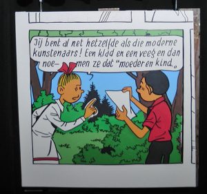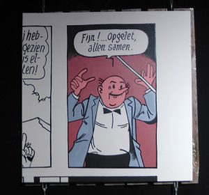 Tijdens het verwerken van de uitgeknipte plaatjes met een opgeheven vingertje uit de Suske en Wiske boeken kwam ik vijf afbeeldingen tegen die samen een aardig beeld geven van waar ik zoal mee bezig ben. Deze vijf plaatjes zijn uitvergroot op doek (elk 95 x 95 cm, latex en acryl op doek):